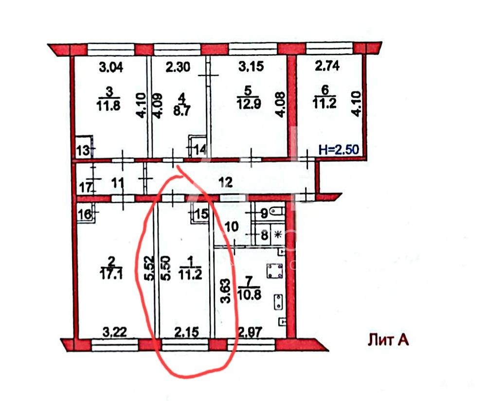 В квартире пять комнат ( из них постоянно проживают только в двух комнатах), общая кухня площадью 10, 8 квадратных метров.